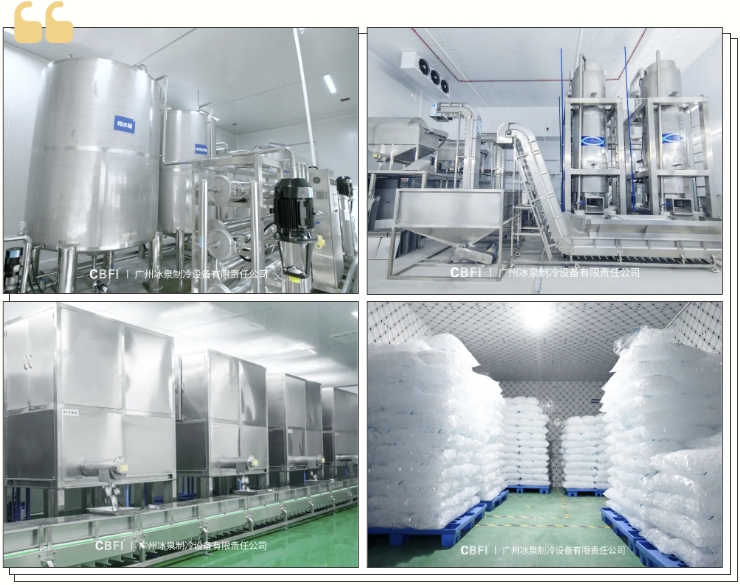 一站式食用冰廠方案可包含水處理車間、主機控制室、制冰車間、冰塊干燥間、冰粒打包車間、外包裝間、冰塊儲存冷庫等。